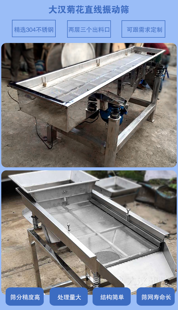 菊花為菊科植物的干燥頭狀花序。主產于浙江、安徽、河南等地。9-11月花盛開時分批采收,陰干或焙干,或熏、蒸后曬干。生用。藥材按產地和加工方法不同,分為“亳菊”、“滁菊”、“貢菊”、“杭菊”等。由于又有花的顏色不同,又有黃菊花和白菊花之分。 菊花在做成成品之前,需要進行除雜分級。這時候就需要用到直線振動篩,菊花直線振動篩篩分精度高,處理量大,結構簡單,篩網使用壽命長,下面有菊花直線振動篩廠家大漢機械為您具體介紹一下菊花直線振動篩: