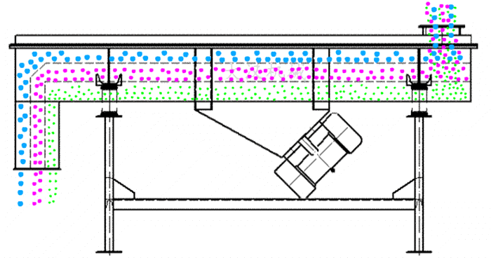 食品直線振動篩結構主要由篩箱、篩框、篩網、振動電機、電機臺座、減振彈簧、支架等組成。采為雙振動電機驅動,當物料從給料機均勻地進入篩分機的進料口時,兩臺電機通過同步、反向旋轉時所產生的激振力在平行于電機軸線的方向相互抵消,在垂直于電機軸的方向疊為一合力,在激振力和物料自重力的共同作用下,使物料在篩面上被拋起向前作直線運動,物料通過多層篩網產生數種規格的篩上物、篩下物,然后又分別從各自的出口排出,從而達到篩分的目的。