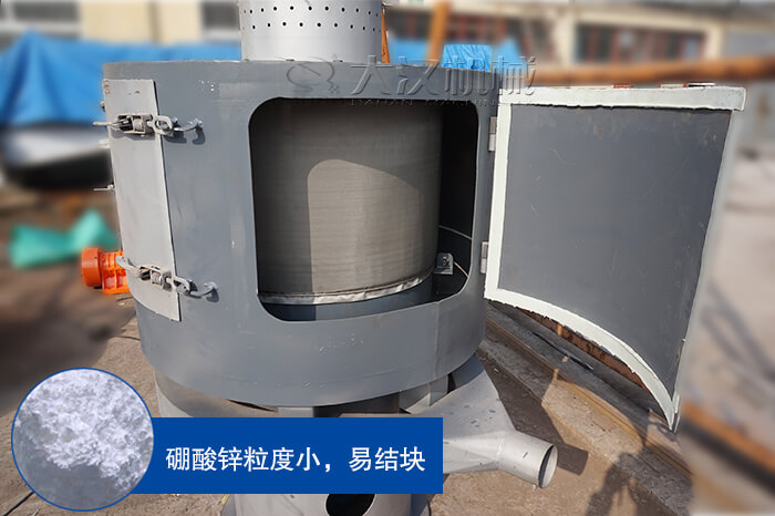由于硼酸鋅密度般比較小,所以在篩分過程中容易粘在篩網上或造成結塊,嚴重影響篩分效率和精度,氣流篩風輪葉片的高速旋轉可以使結塊物料被打碎,相當于臺破碎機和臺篩分機的組合,提高了篩分效率。