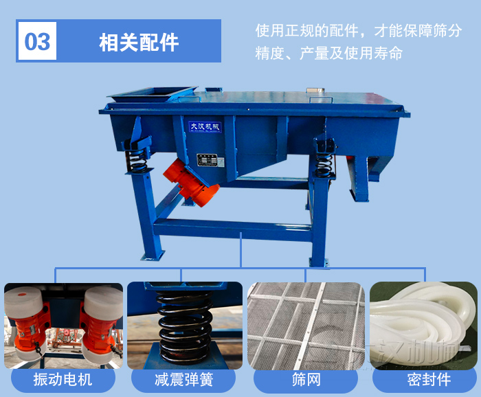 直線振動篩的配件包含:振動電機、減震彈簧、密封件、篩網、清網裝置,振動電機作為臺篩分設備的動力源其優劣直接關系到設備的產量與使用壽命,篩網的選用也應該注重篩網的絲經、材質,配件需要有正規的配件供應商提供,這樣才能保障篩分精度、產量及使用壽命,而選擇不同配置的設備,其價格勢必會有所影響,舉例來說,防爆電機與普通電機相比,價格會貴200-300元,非金屬篩網相較金屬篩網會便宜50%。